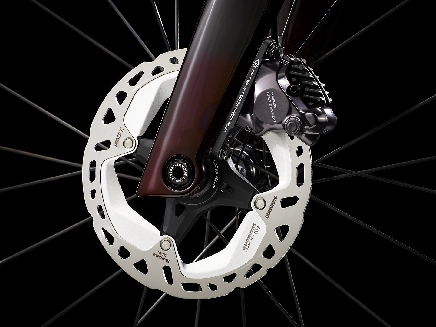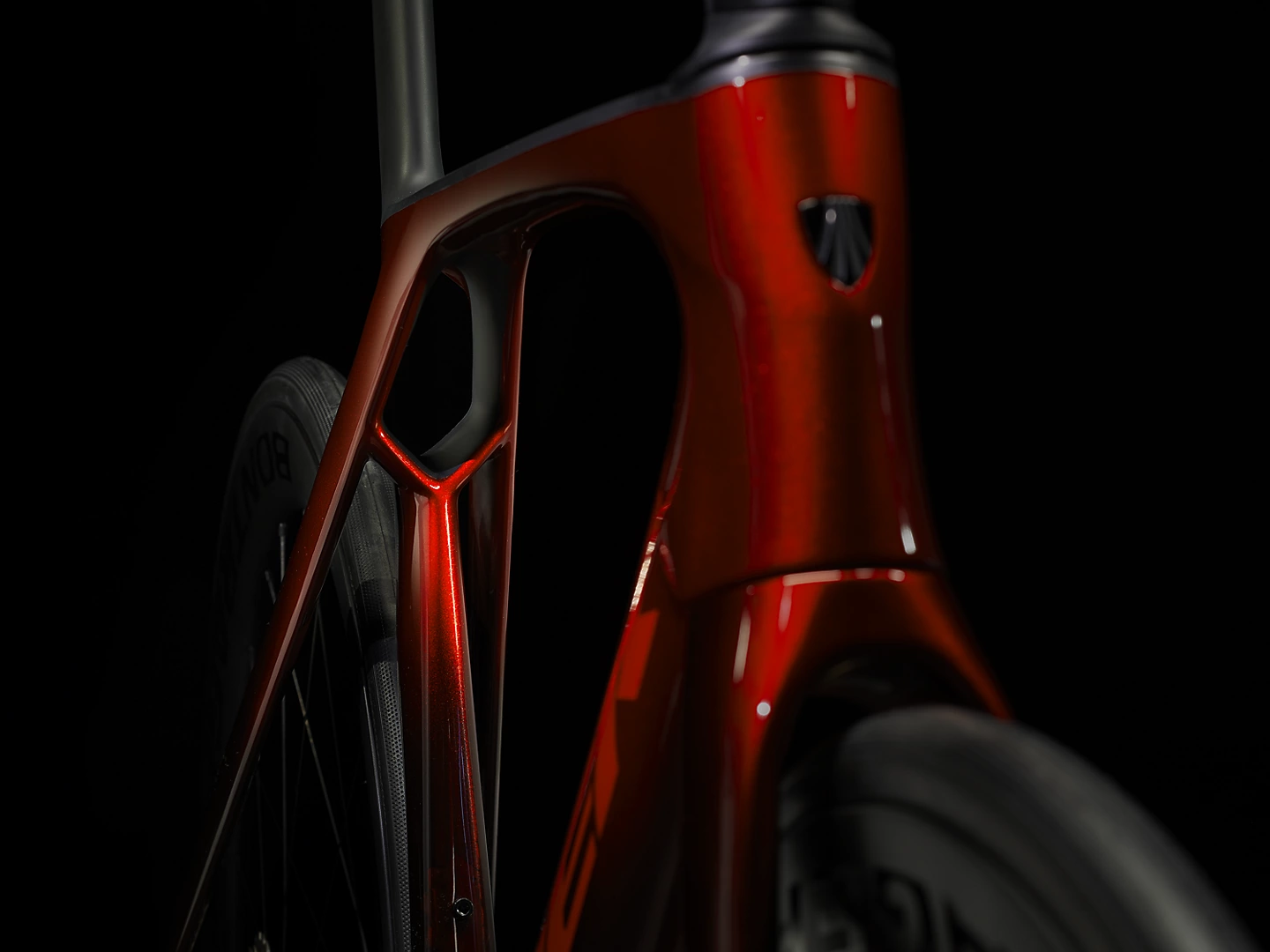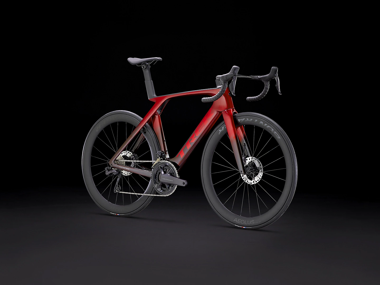 Um quadro leve com nosso Carbono OCLV Série 800 de mais alto nível, novo formato de tubos aerodinâmico Kammtail Virtual Foil, tecnologia aerodinâmica e amortecedora de vibrações da estrada IsoFlow e roteamento de cabos oculto. Uma transmissão eletrônica 2×12 Dura-Ace Di2 Shimano sem fio e freios a disco hidráulicos de montagem plana, rodas de carbono Aeolus RSL 51 Bontrager prontas para tubeless e uma combinação integrada de guidão/avanço de carbono OCLV.