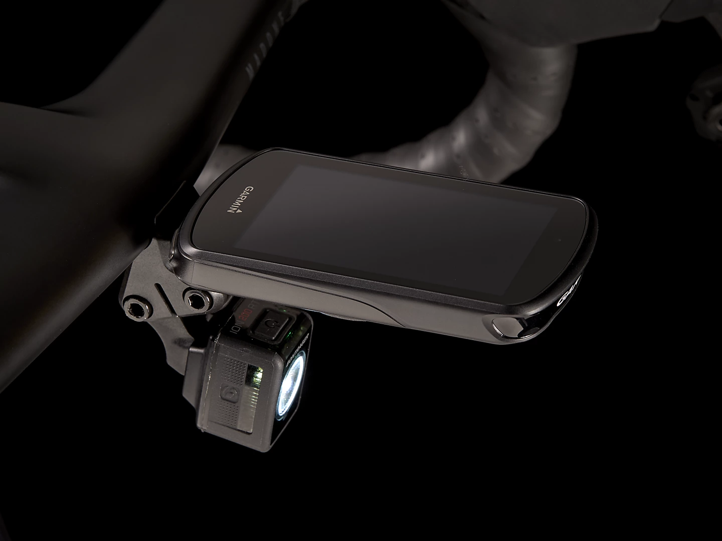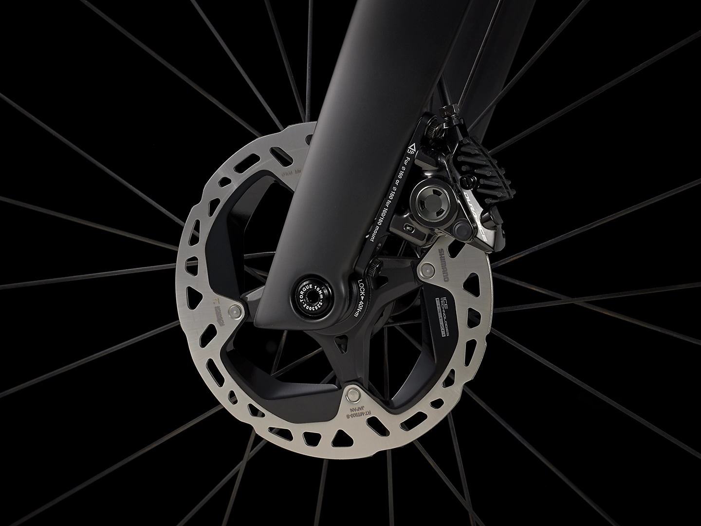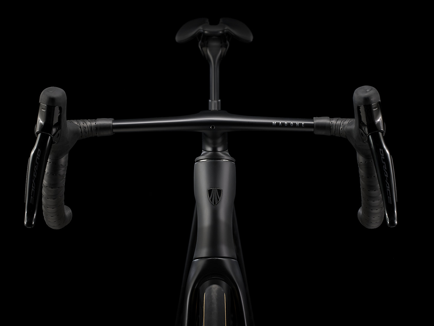Um quadro leve com nosso Carbono OCLV Série 800 de mais alto nível, novo formato de tubos aerodinâmico Kammtail Virtual Foil, tecnologia aerodinâmica e amortecedora de vibrações da estrada IsoFlow e roteamento de cabos oculto. Uma transmissão eletrônica 2×12 Dura-Ace Di2 Shimano sem fio e freios a disco hidráulicos de montagem plana, rodas de carbono Aeolus RSL 51 Bontrager prontas para tubeless e uma combinação integrada de guidão/avanço de carbono OCLV.