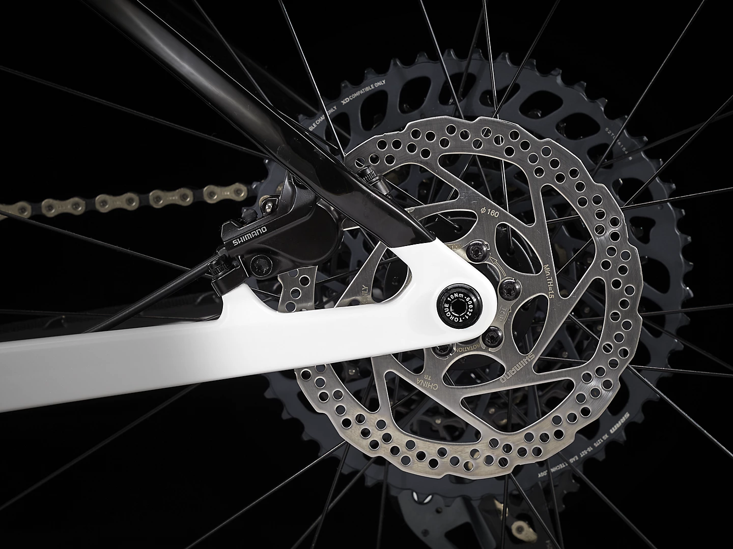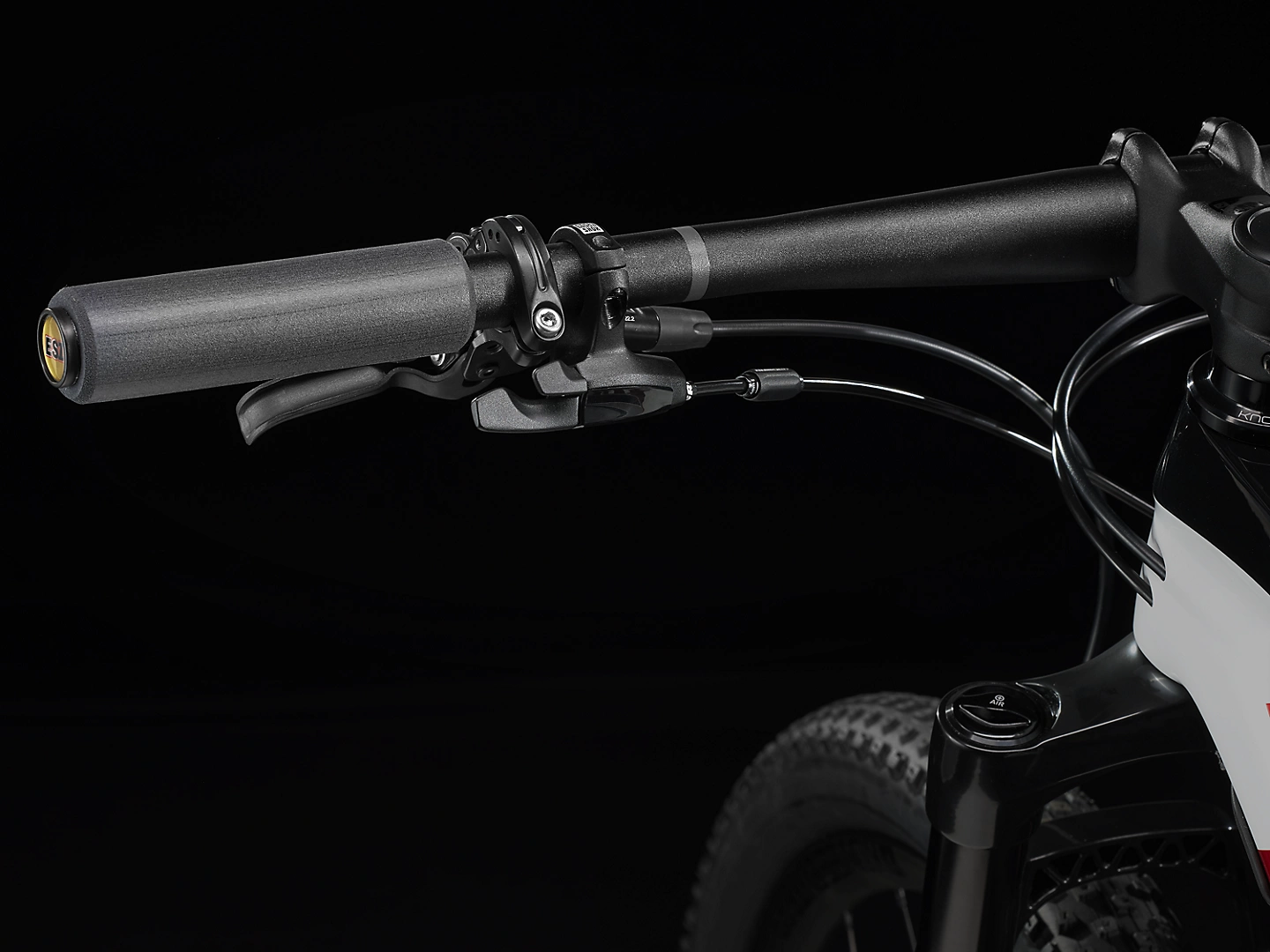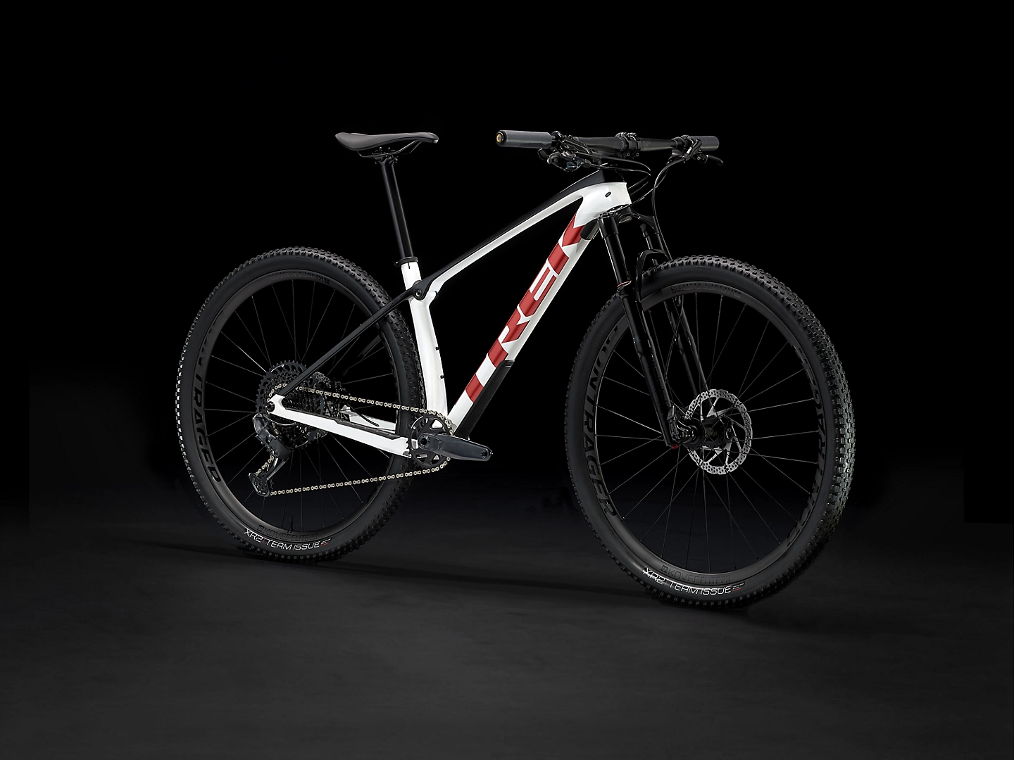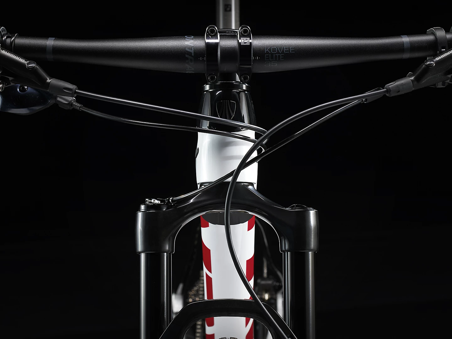 Um quadro de carbono leve e rígido com IsoSpeed suavizador de trilhas, um garfo RockShox Reba RL mais leve com mola pneumática Solo Air, um amortecedor com controle de movimento e um bloqueio remoto, uma transmissão SRAM GX Eagle com uma faixa de marchas extra ampla, rodas de carbono rápidas Bontrager Kovee Elite 23 de 29 pol e um canote de carbono.