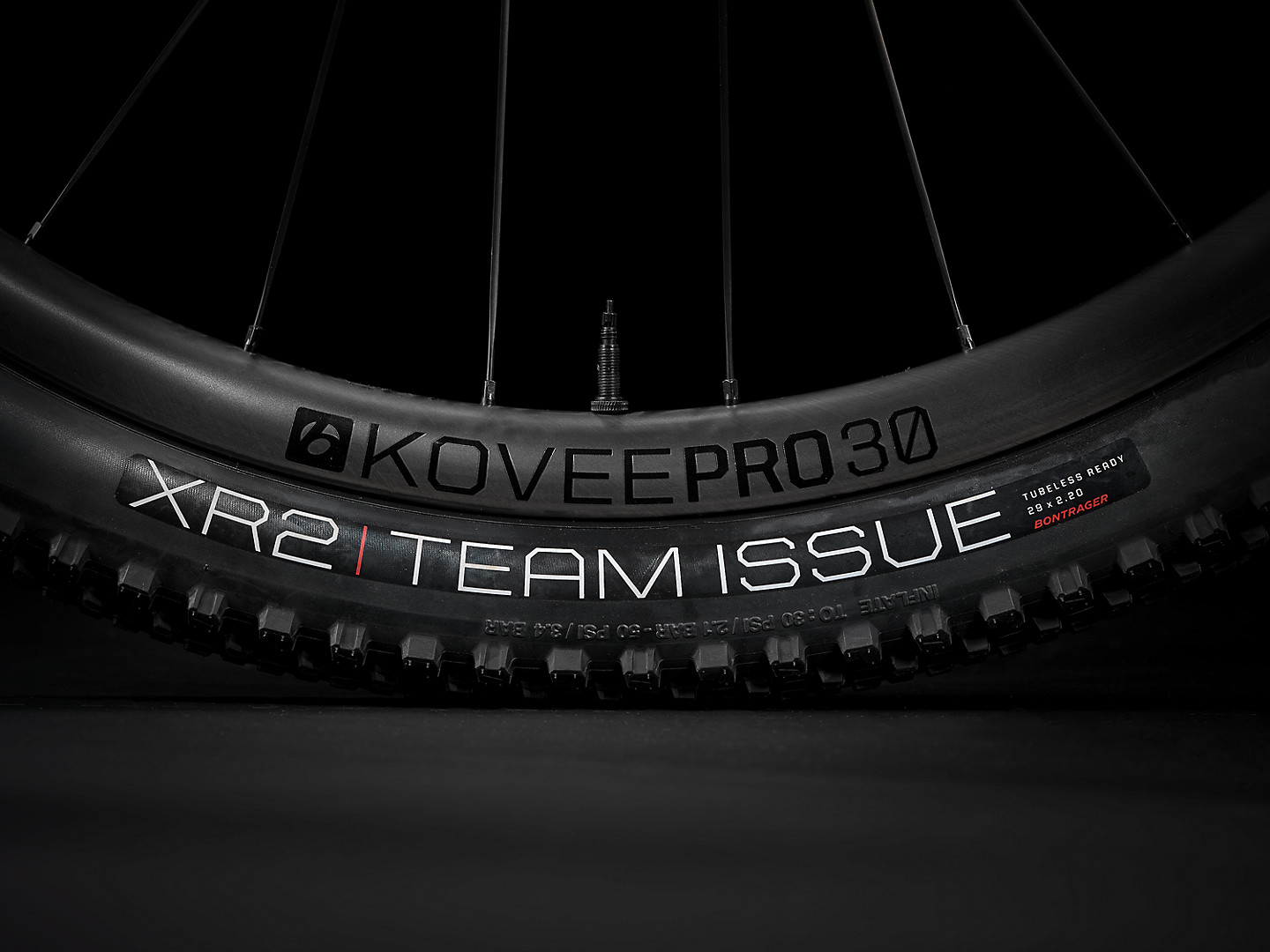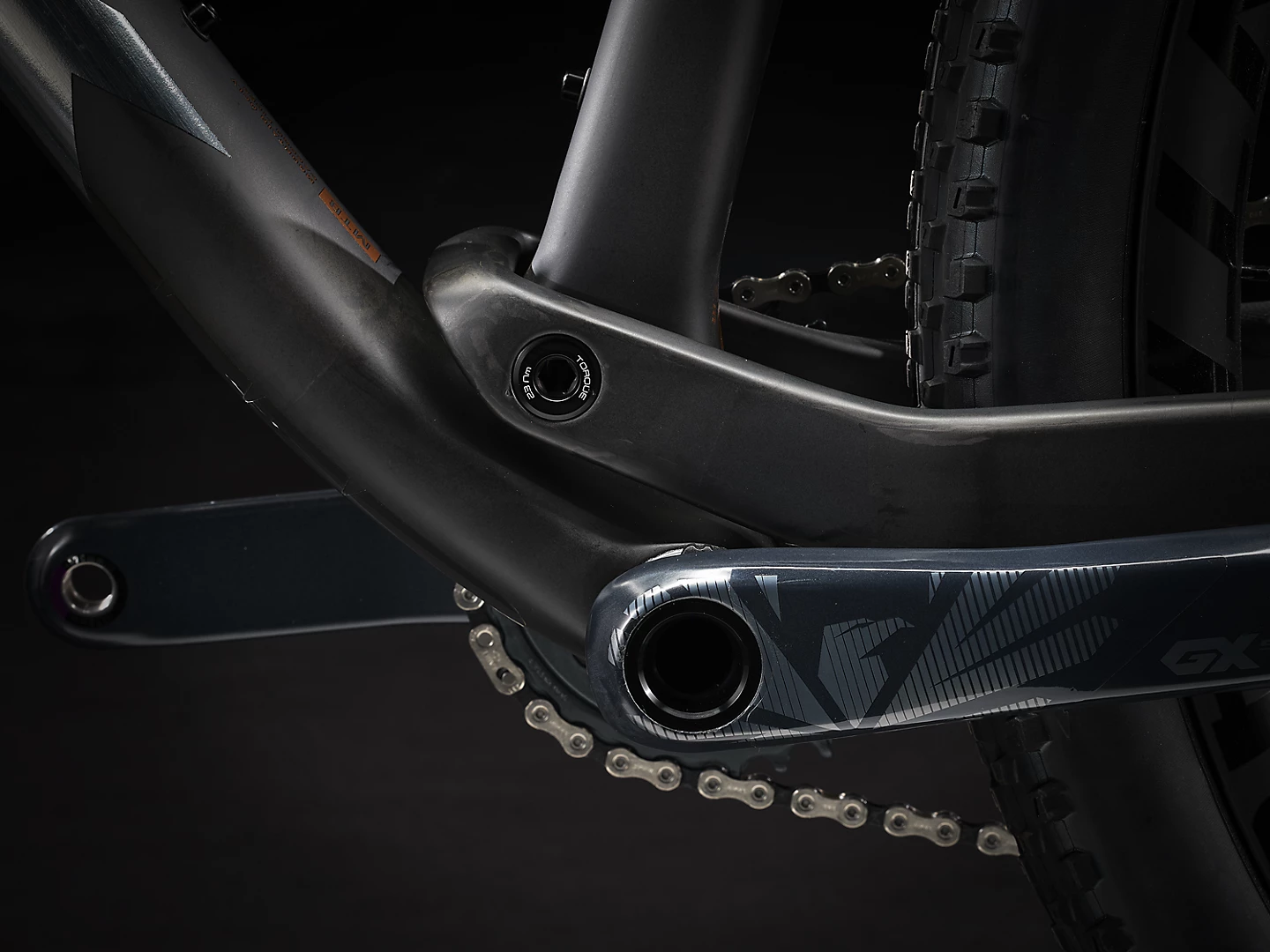 Um quadro ultraleve totalmente de carbono OCLV para mountain bikes com curso de 60 mm, garfo RockShox SID SL 100 mm e o exclusivo amortecedor IsoStrut FOX Performance da Trek, projetado especificamente para a Supercaliber. Além disso, duplo bloqueio remoto de suspensão, transmissão eletrônica sem fio GX Eagle AXS SRAM 1×12 com pedivelas de carbono e um cassete 10-52, rodas de carbono Kovee Pro 30 Bontrager com cubo traseiro Rapid Drive de 108 dentes para engate instantâneo.